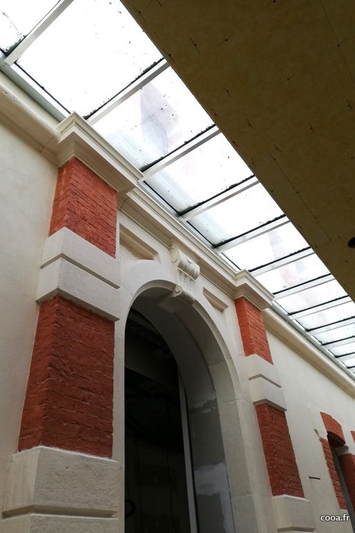 Le hall d’entrée correspond à une partie du bâtiment qui a été totalement rajoutée. L’entrée est mise en avant et fait entrer la lumière. « La verrière qu’on retrouve entre le hall et le bâtiment d’origine permet cette ouverture sur la rue. On a l’impression d’être à l’extérieur sans y être. », commente Hervé Morgant, conducteur d’opération au sein de l’Agglomération Valence-Romans.