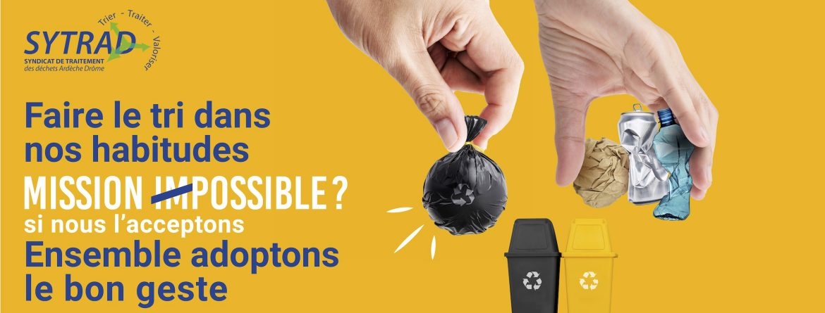 Faire changer les comportements & instaurer le « bon geste » de tri, près de la moitié des poubelles noires sont composées d’emballages & de papiers recyclables. Le bon geste, c’est de les jeter dans le bac de tri (jaune ou bleu) pour réduire la poubelle d’ordures ménagères
