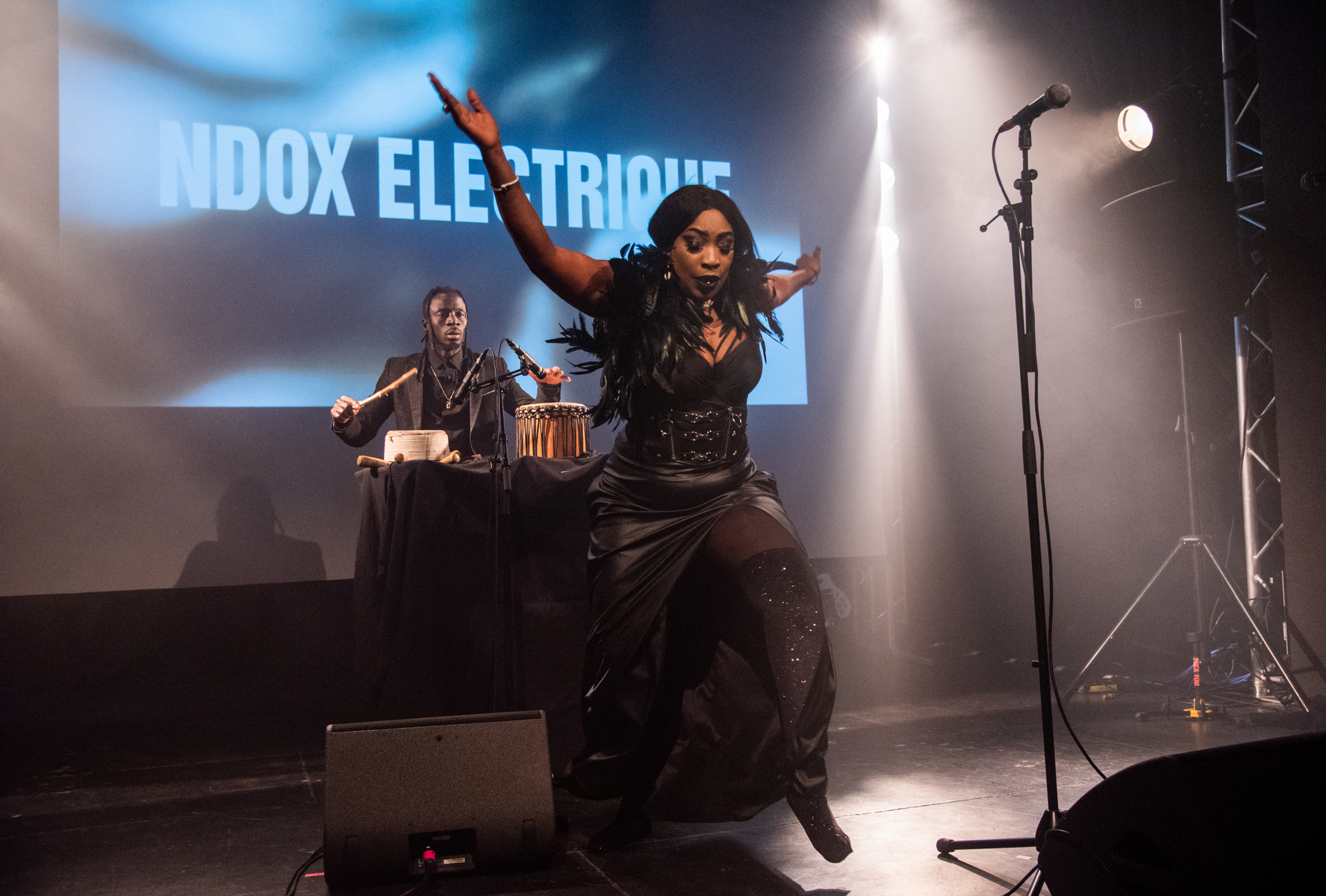 Puis vint le tour de Ndox Electrique, qui a marqué les esprits dès son entrée en scène en chantant a cappella au milieu du public. Le groupe, composé d’une chanteuse et danseuse, d’un percussionniste, d’un bassiste et d’un guitariste, a immédiatement capté l’attention par son approche immersive et participative. Leur prestation originale, portée par une énergie scénique débordante et une forte complicité avec le public, a rapidement transformé la salle en un véritable voyage spirituel.