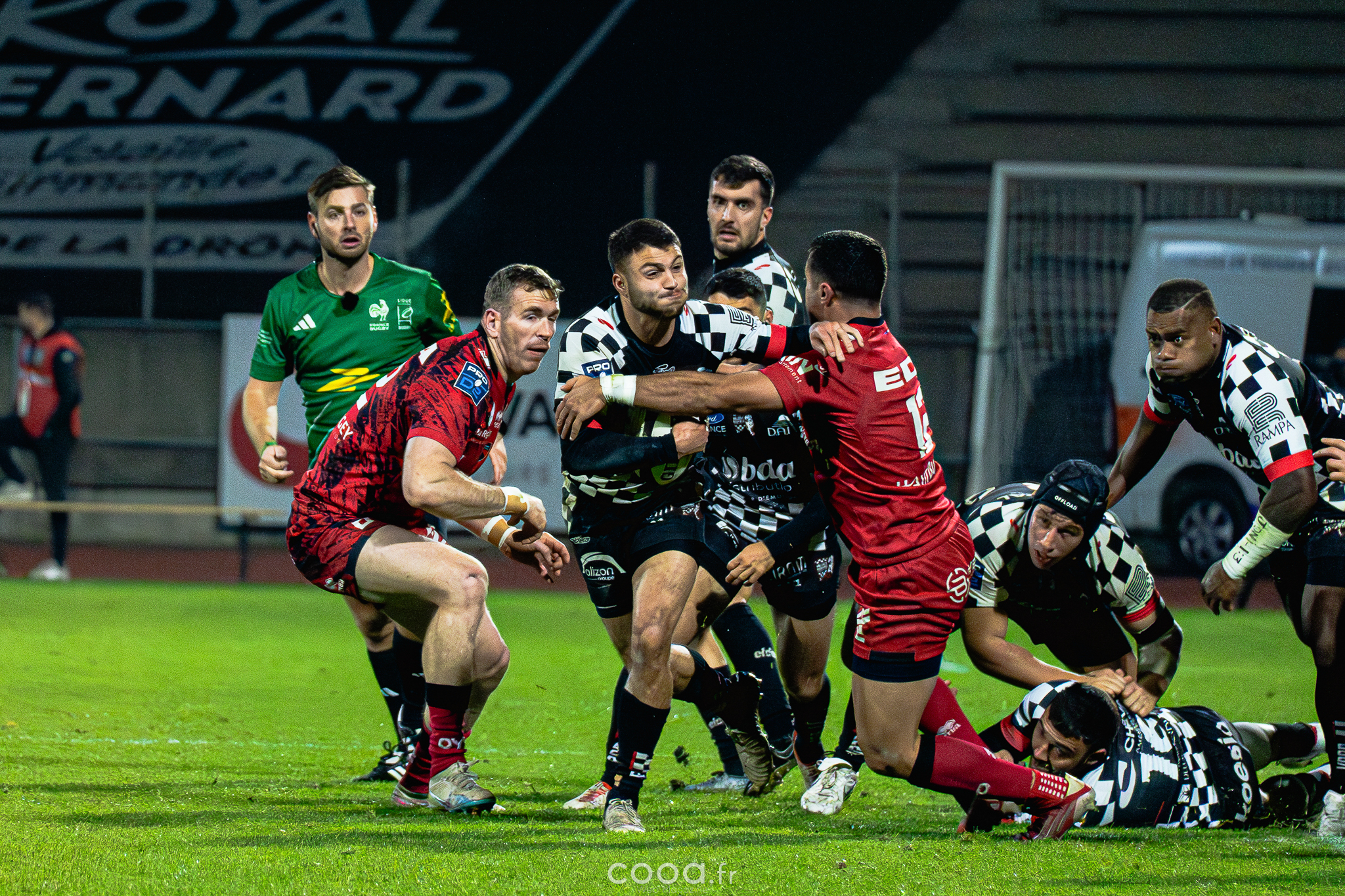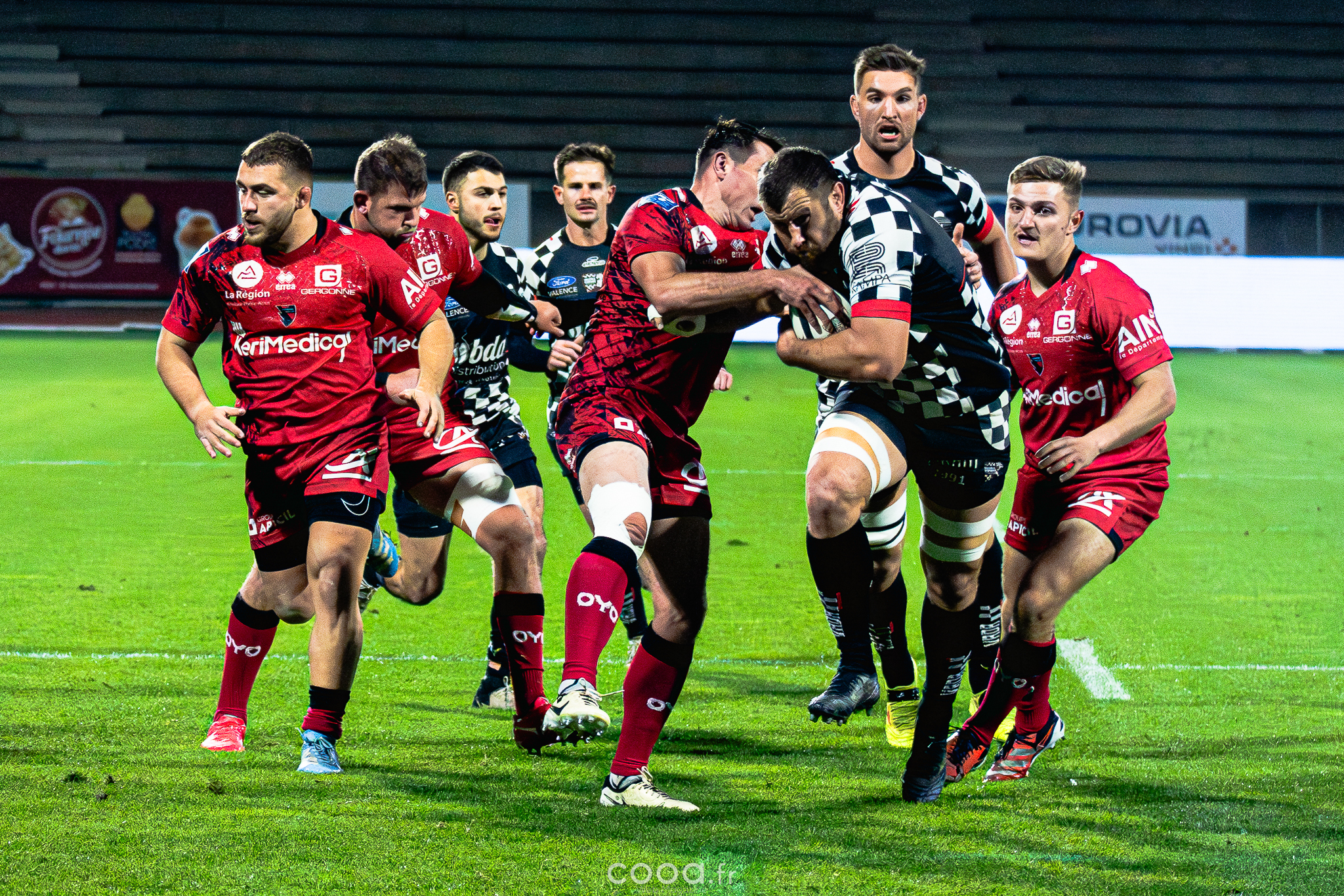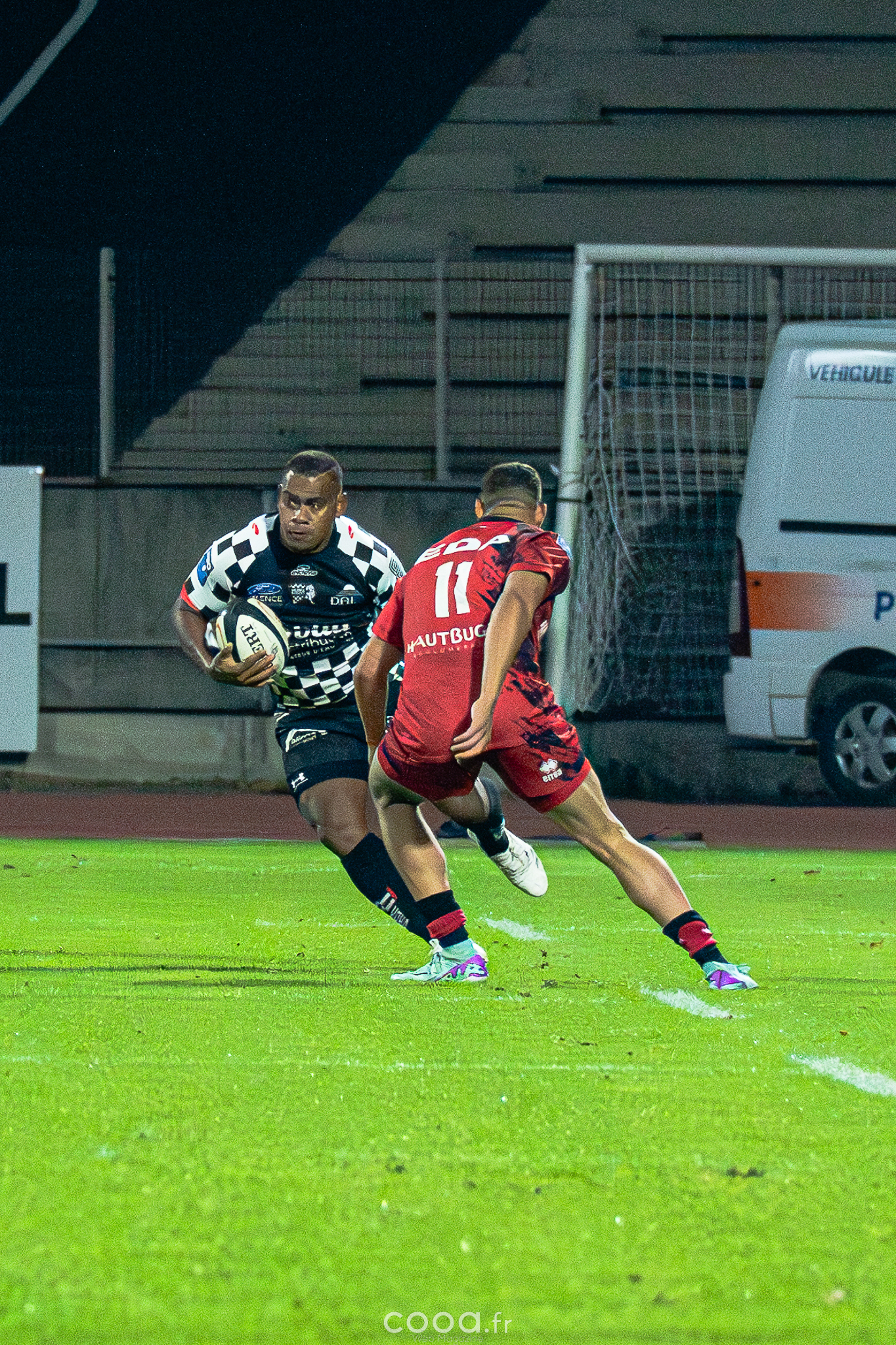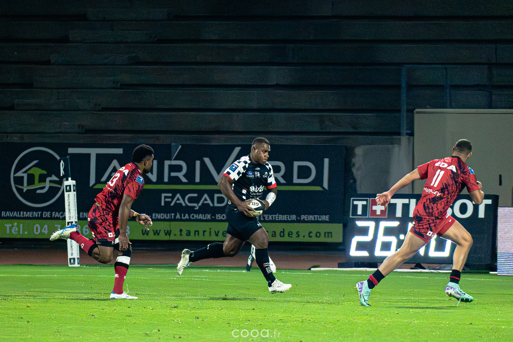 Dans ce duel de bas de tableau et devant 4 300 supporters, le VRDR a rapidement pris l’avantage grâce à deux essais d’Hugo Deligny. Avec un Lucas Méret précis au pied, les Damiers menaient à la pause (15-6). Malgré des maladresses récurrentes des deux équipes, Oyonnax montait en puissance en deuxième mi-temps. David Odiase, entré en jeu, inscrivait un essai qui ramenait les visiteurs à deux points (18-16).