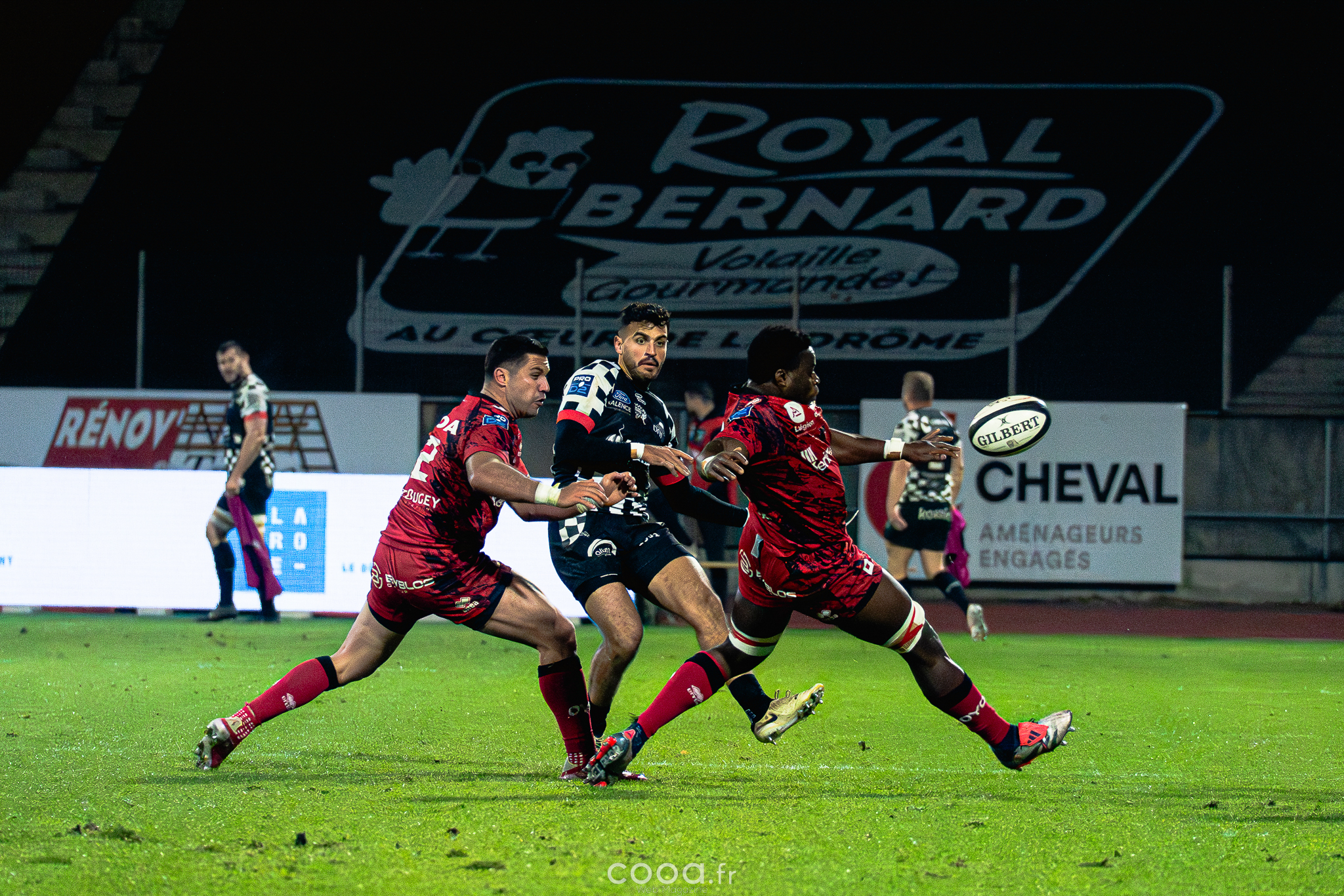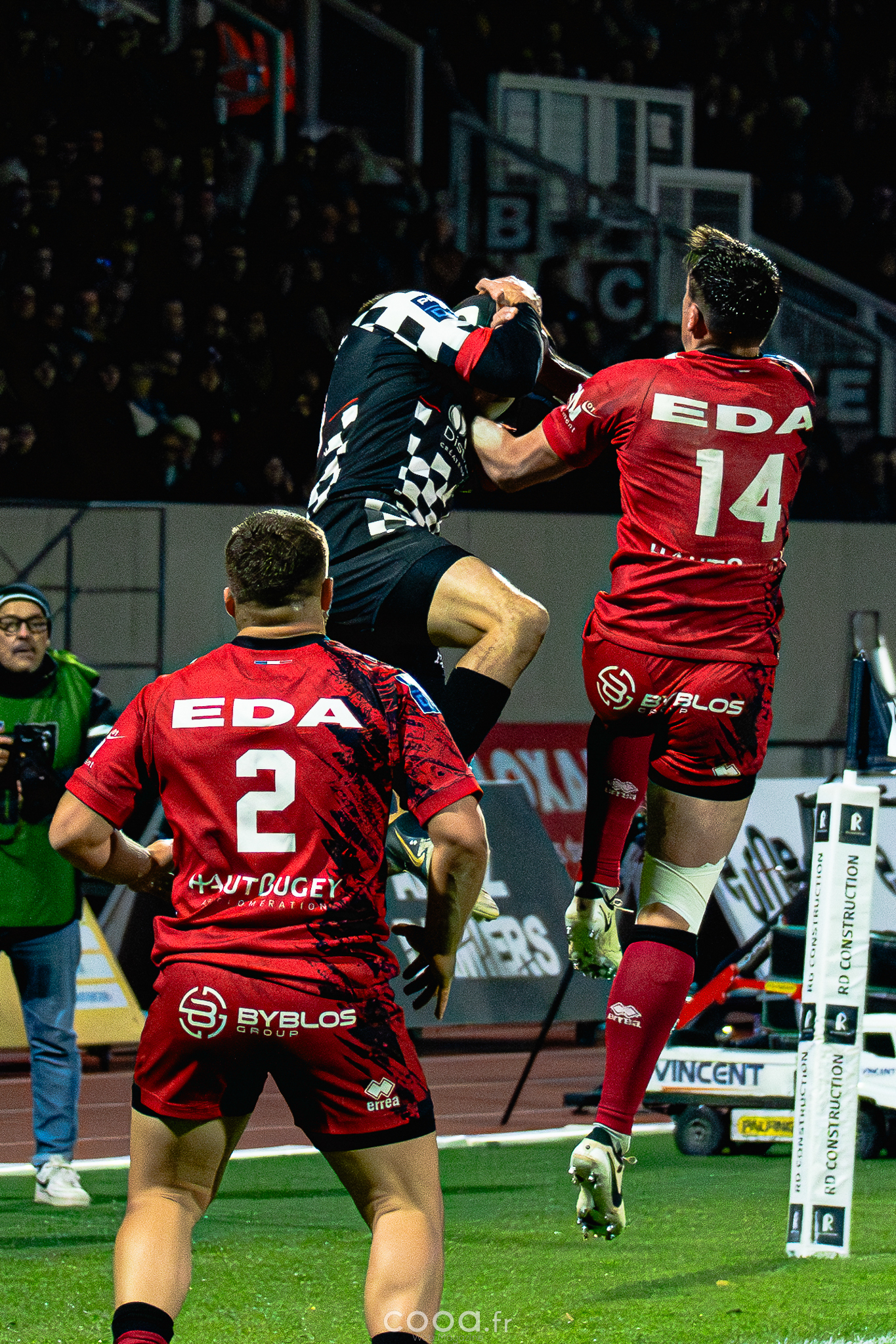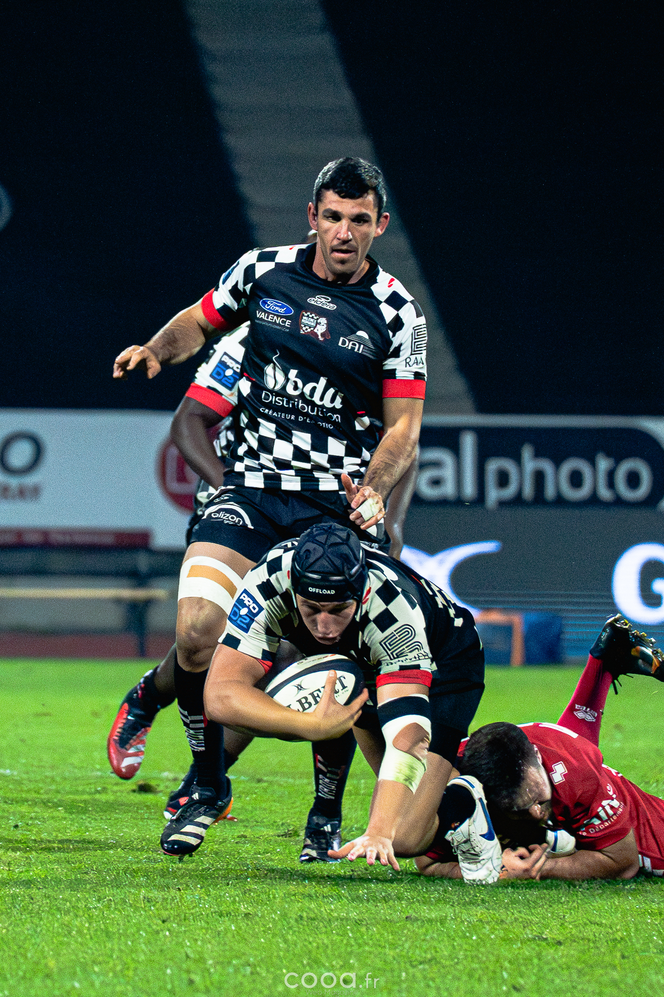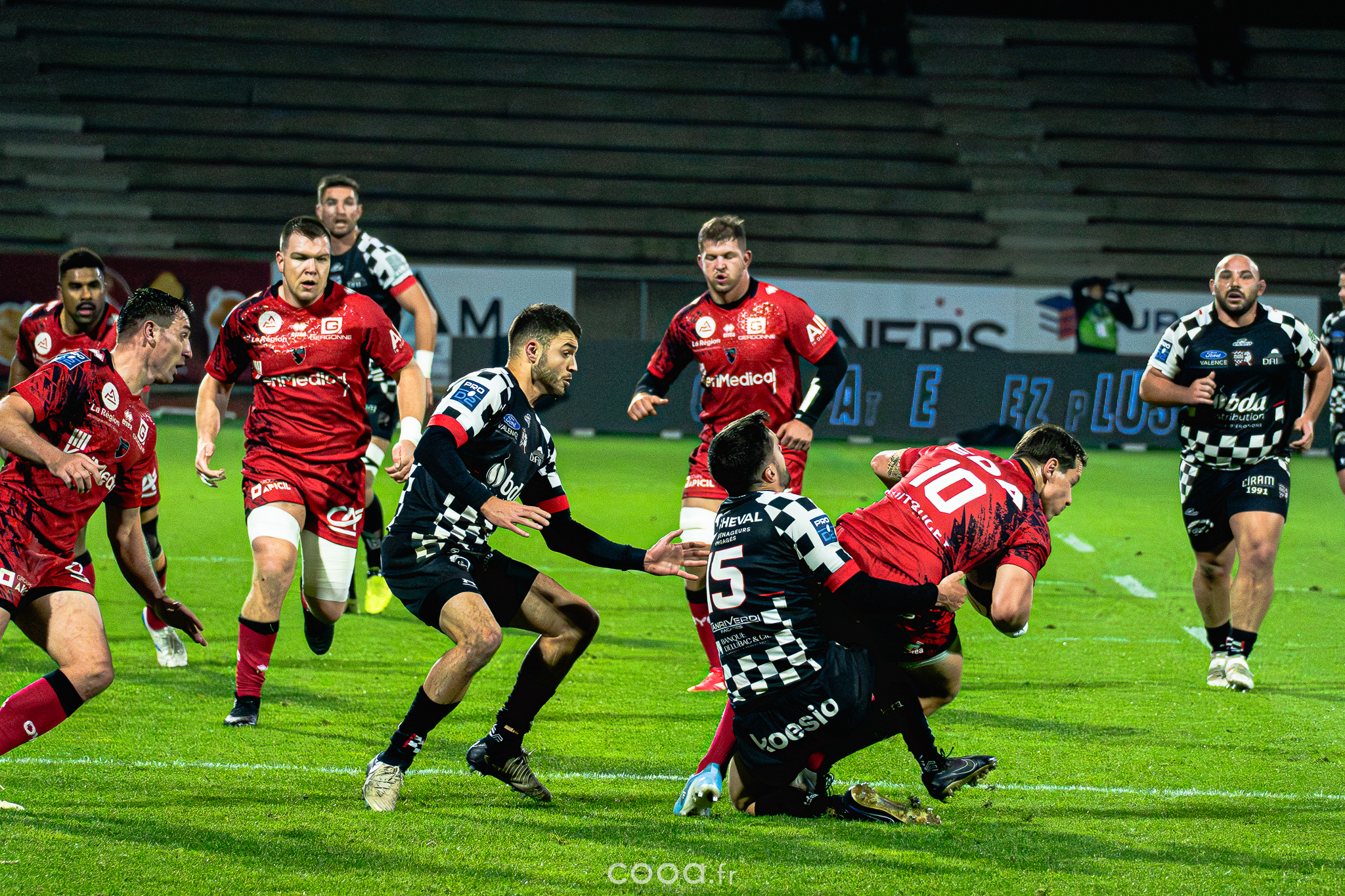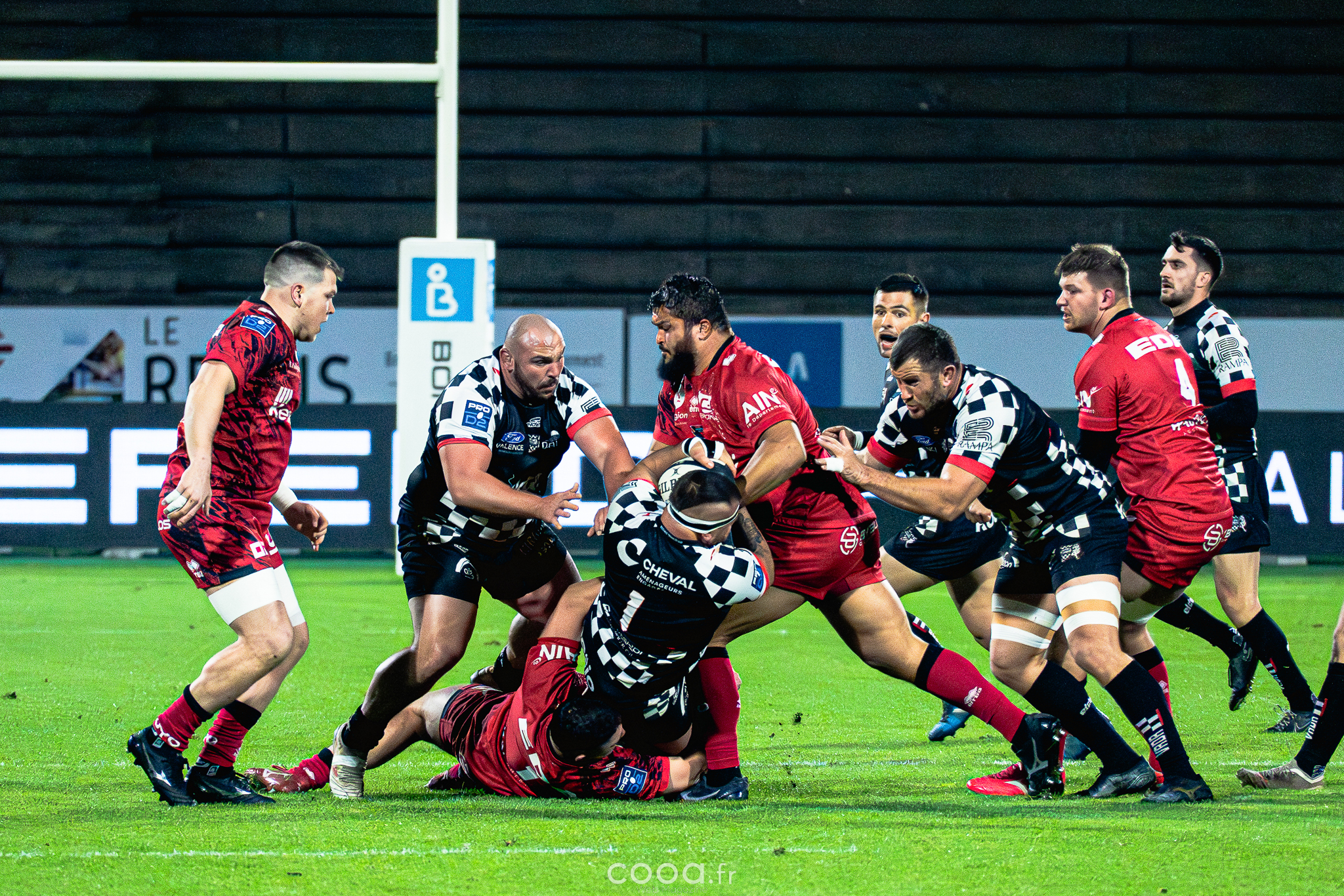 Dans ce duel de bas de tableau et devant 4 300 supporters, le VRDR a rapidement pris l’avantage grâce à deux essais d’Hugo Deligny. Avec un Lucas Méret précis au pied, les Damiers menaient à la pause (15-6). Malgré des maladresses récurrentes des deux équipes, Oyonnax montait en puissance en deuxième mi-temps. David Odiase, entré en jeu, inscrivait un essai qui ramenait les visiteurs à deux points (18-16).
