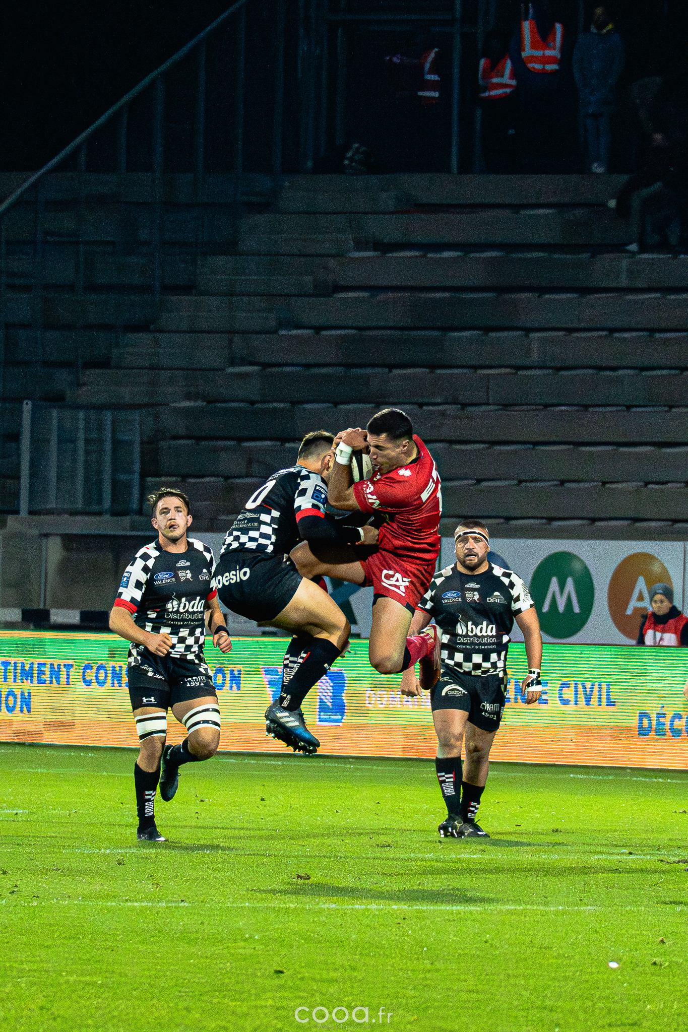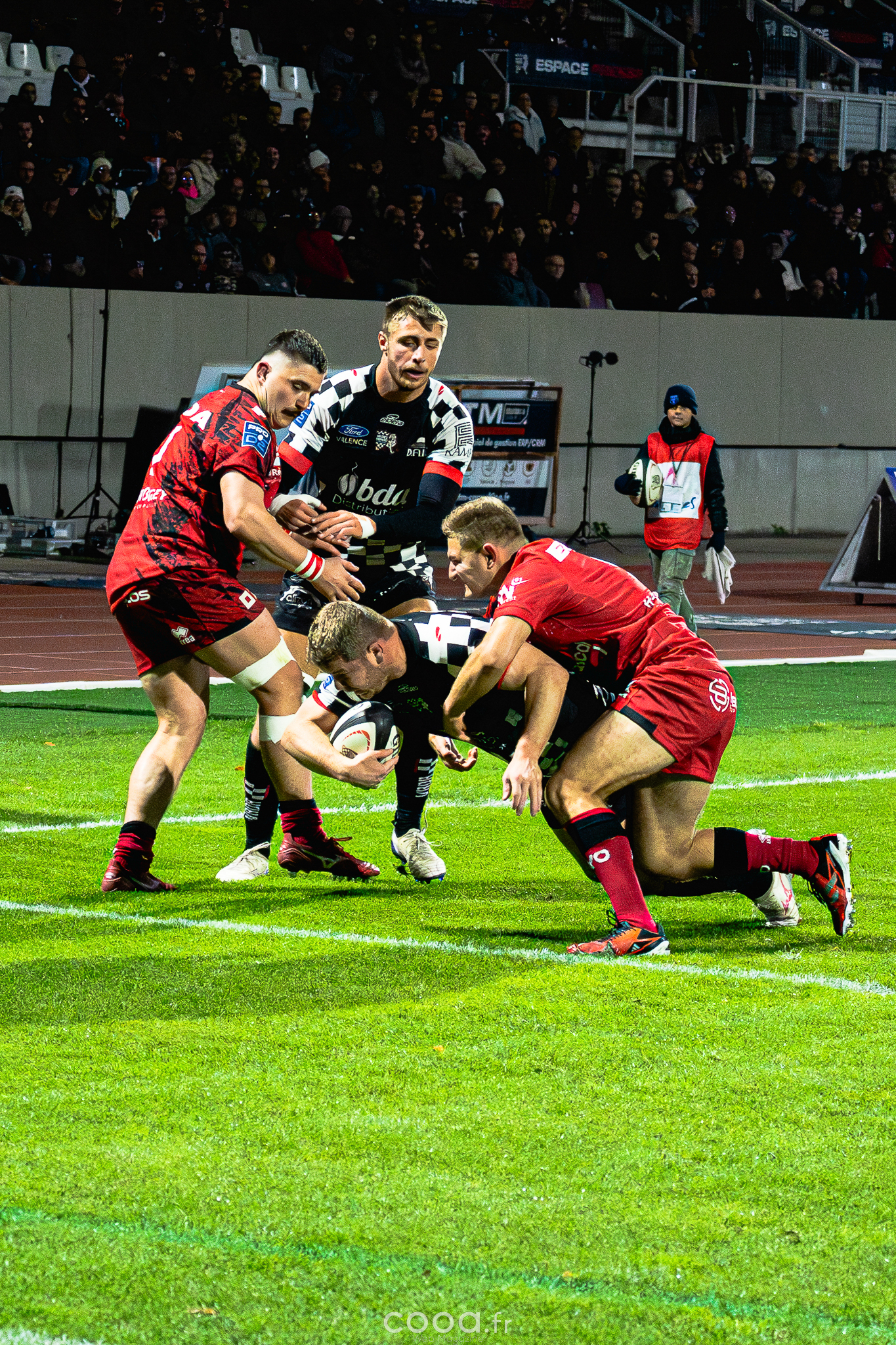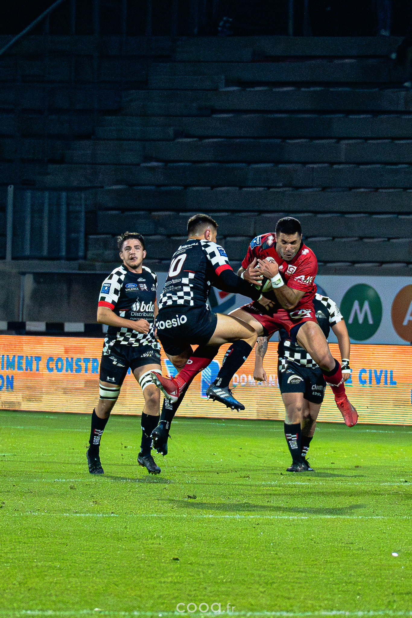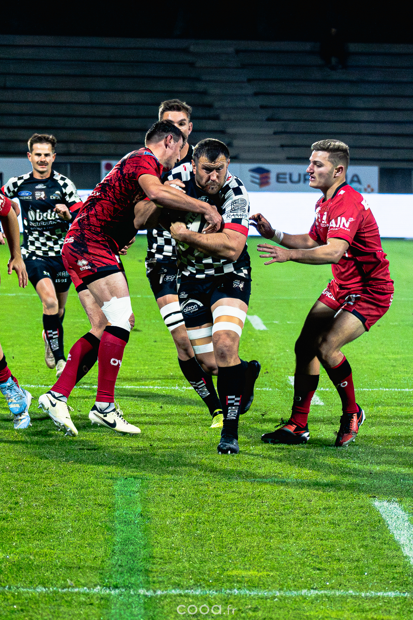 Dans ce duel de bas de tableau et devant 4 300 supporters, le VRDR a rapidement pris l’avantage grâce à deux essais d’Hugo Deligny. Avec un Lucas Méret précis au pied, les Damiers menaient à la pause (15-6). Malgré des maladresses récurrentes des deux équipes, Oyonnax montait en puissance en deuxième mi-temps. David Odiase, entré en jeu, inscrivait un essai qui ramenait les visiteurs à deux points (18-16).