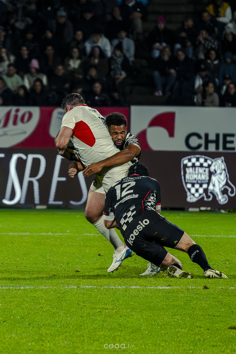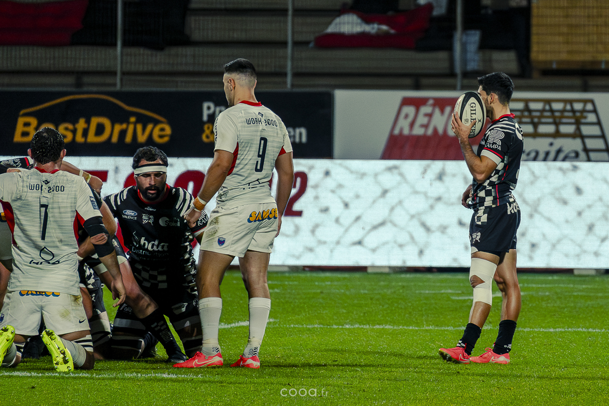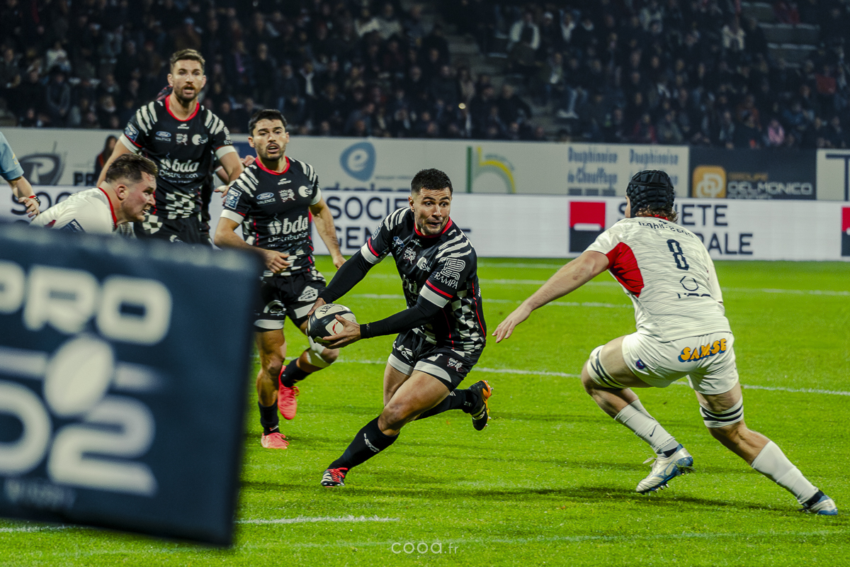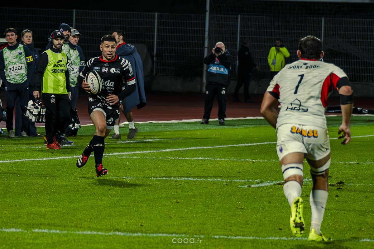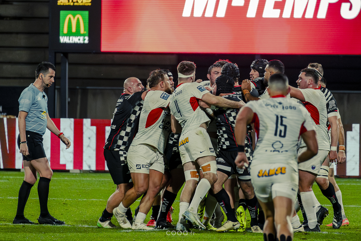 Pendant plus de vingt minutes, Valence Romans a multiplié les temps forts, avançant constamment et repoussant Grenoble dans son camp. Même lorsque les Isérois ont, pour la première fois, pénétré dans les cinq mètres drômois vers la 20e minute, la défense damier a tenu avec autorité. Pourtant, la rencontre a totalement changé de visage à la 28e minute lorsque Barnabé Couilloud a jailli pour intercepter un ballon dans les 22 drômois, lançant une folle contre-attaque de 80 mètres conclue par Costa-Storti. Bien que la transformation ait heurté le poteau, cet essai a relancé Grenoble et redynamisé le derby.