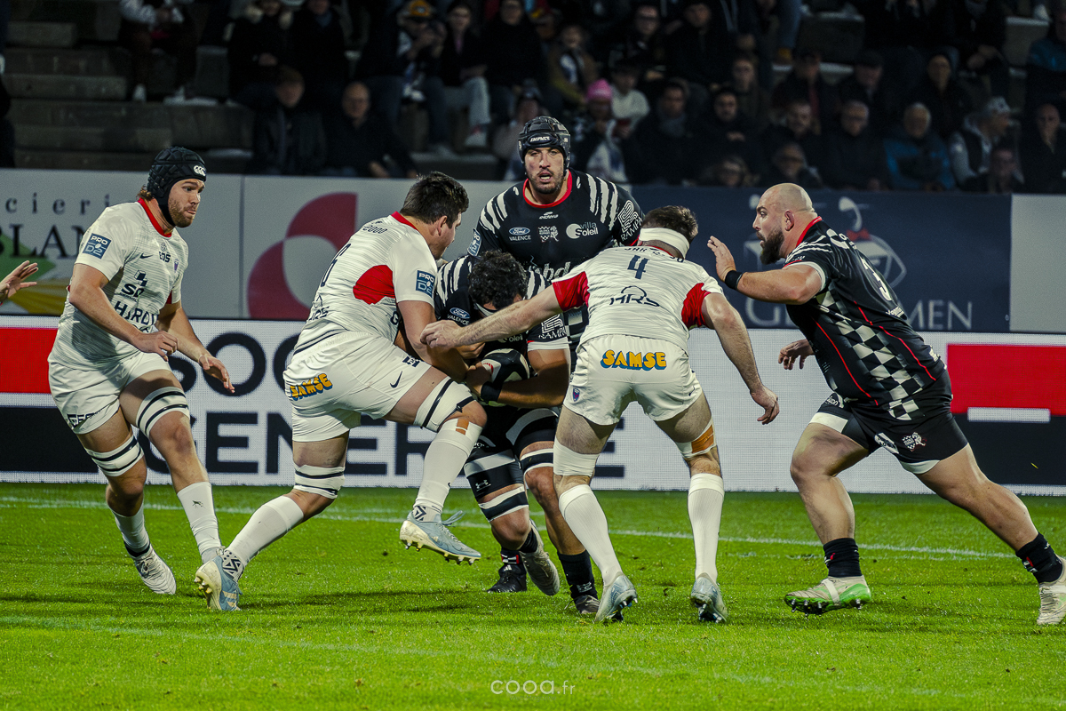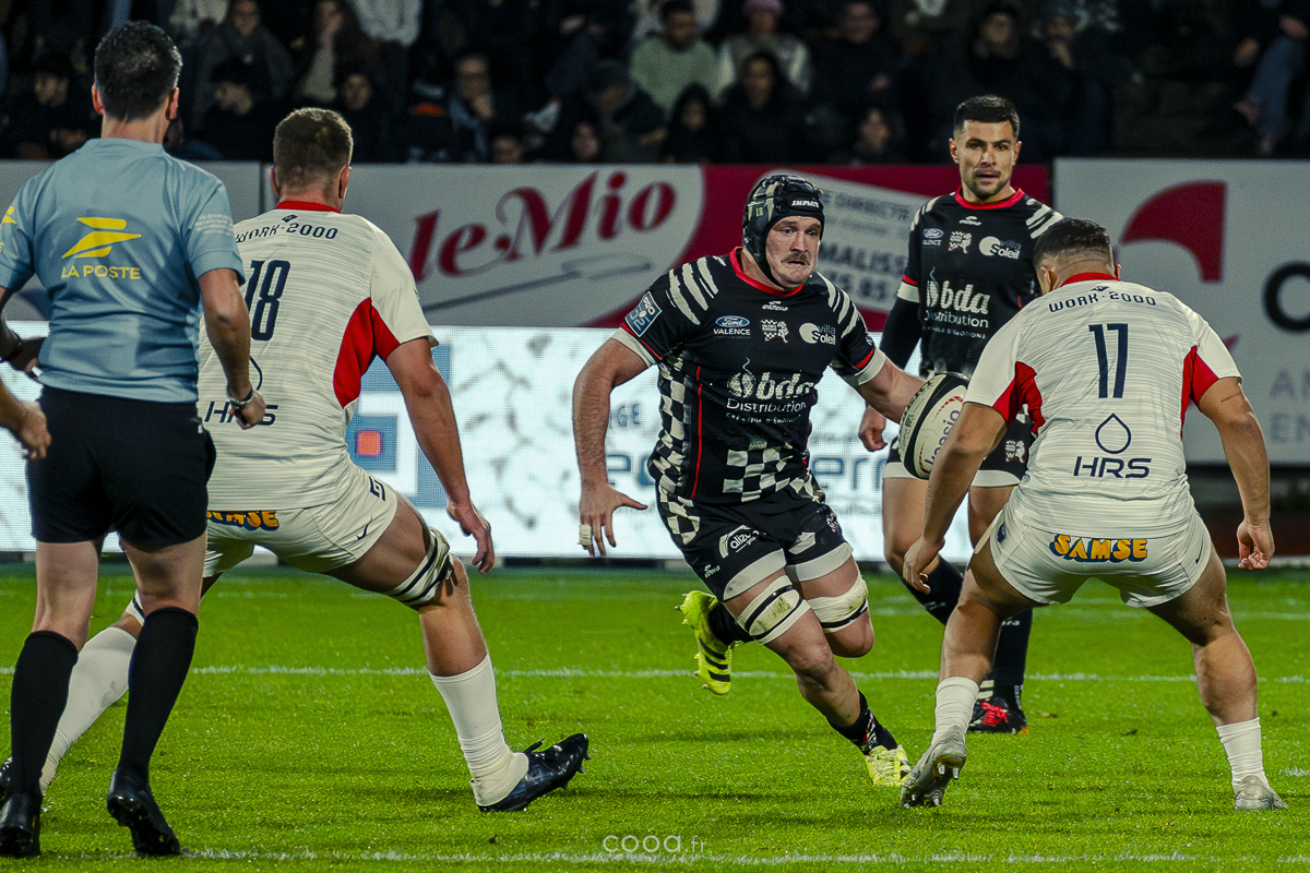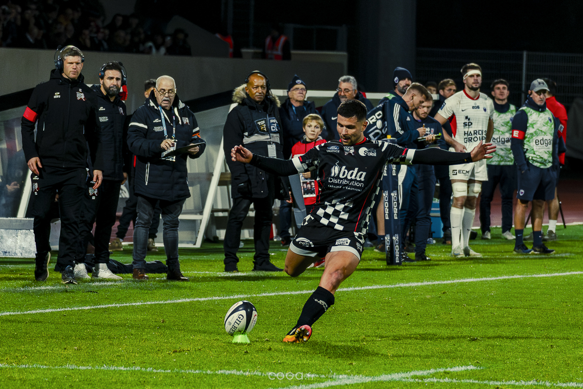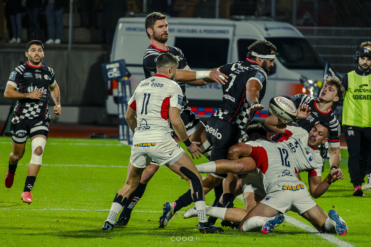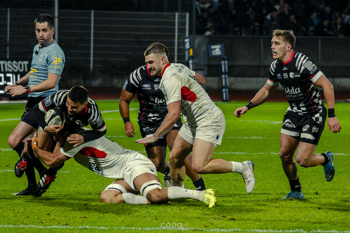 Pendant plus de vingt minutes, Valence Romans a multiplié les temps forts, avançant constamment et repoussant Grenoble dans son camp. Même lorsque les Isérois ont, pour la première fois, pénétré dans les cinq mètres drômois vers la 20e minute, la défense damier a tenu avec autorité. Pourtant, la rencontre a totalement changé de visage à la 28e minute lorsque Barnabé Couilloud a jailli pour intercepter un ballon dans les 22 drômois, lançant une folle contre-attaque de 80 mètres conclue par Costa-Storti. Bien que la transformation ait heurté le poteau, cet essai a relancé Grenoble et redynamisé le derby.